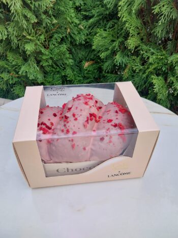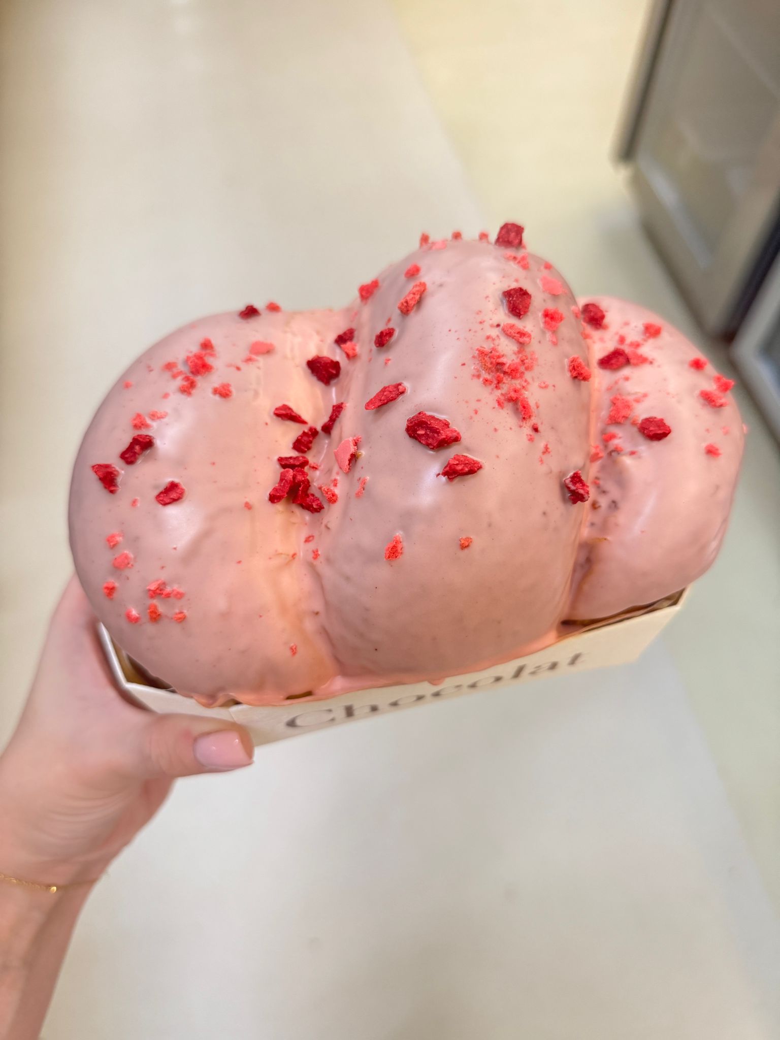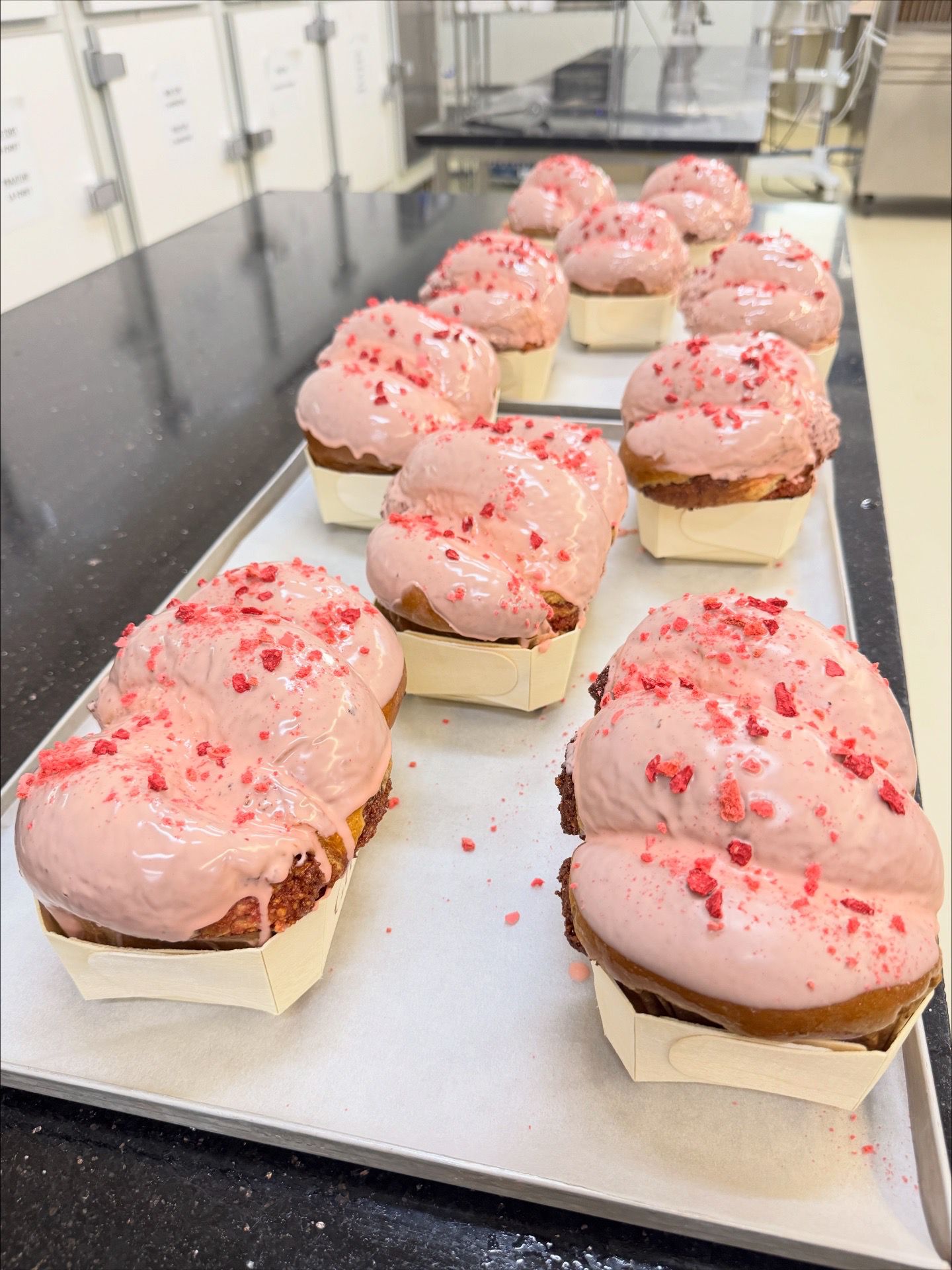 Cozonac cu aluat cozonac, cremă de migdale cu zmeură și trandafir, glazurat în ciocolată și cu zmeură liofilizată